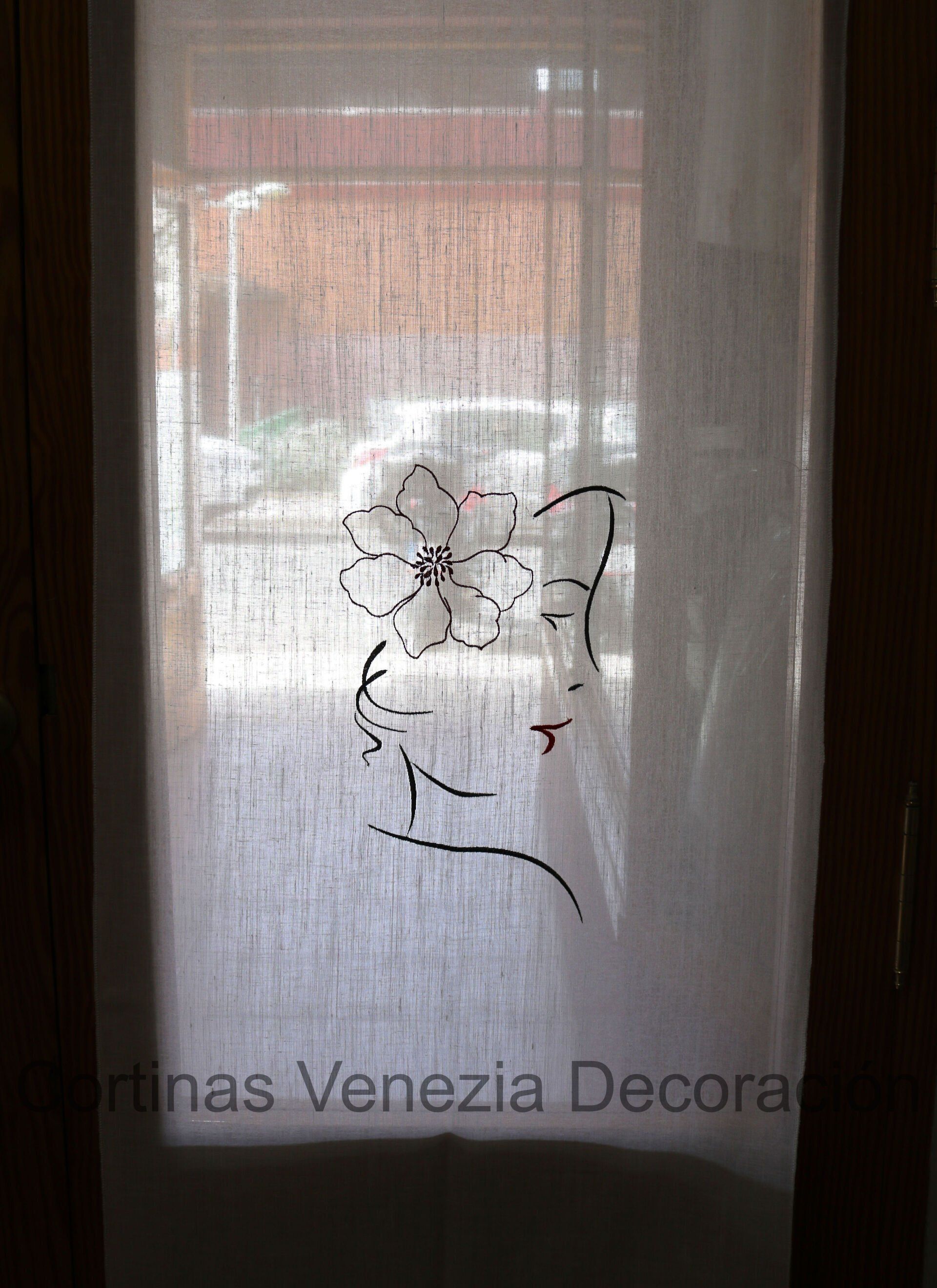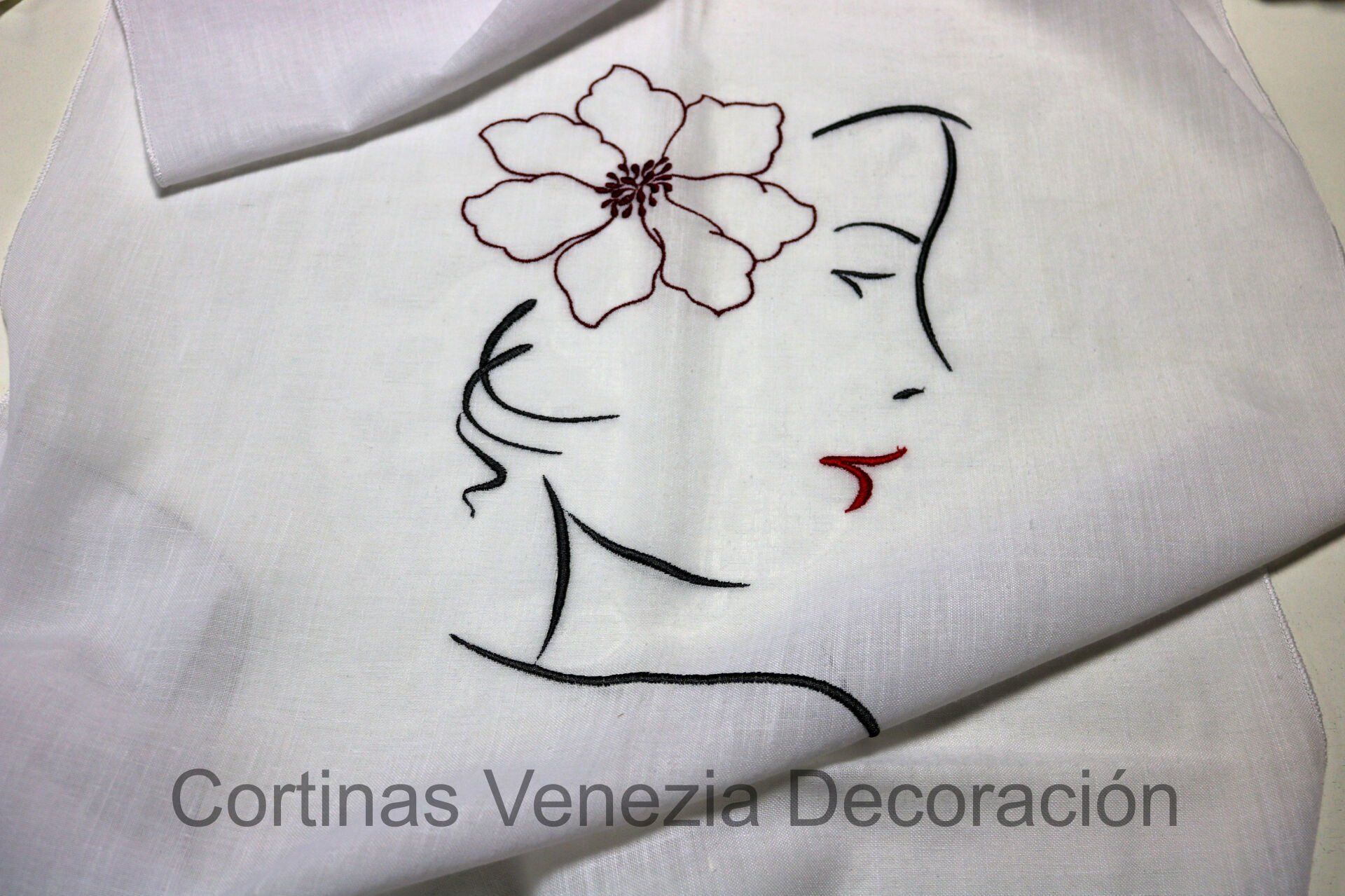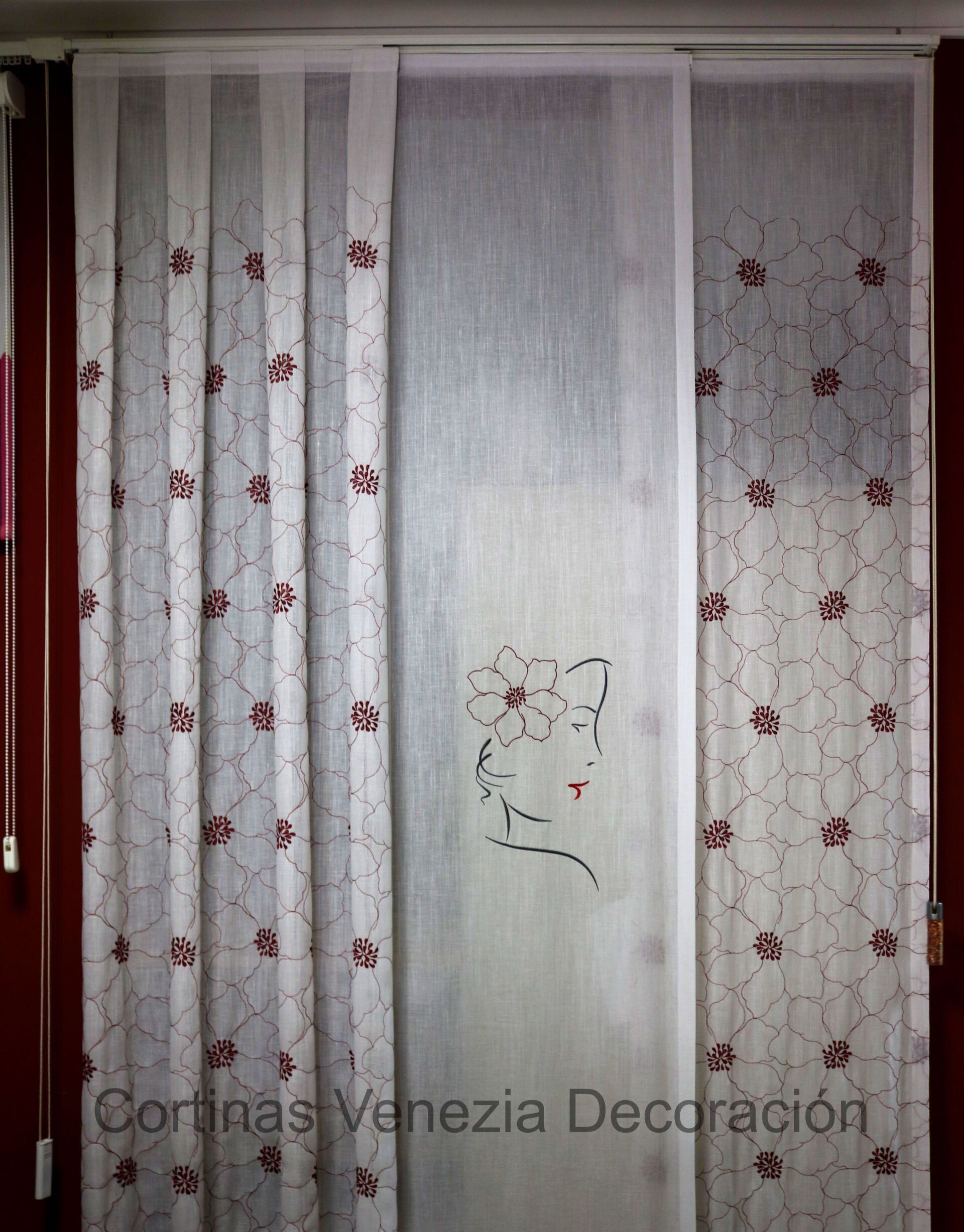 Tejido color Blanco con bordado de cara femenina. De opacidad suave. Este tejido es moderno y con personalidad, ideal para dormitorios y salones, tanto en panel como en estor. Combínalo con otro tejido a modo de caídas o de apliques para un toque de color.