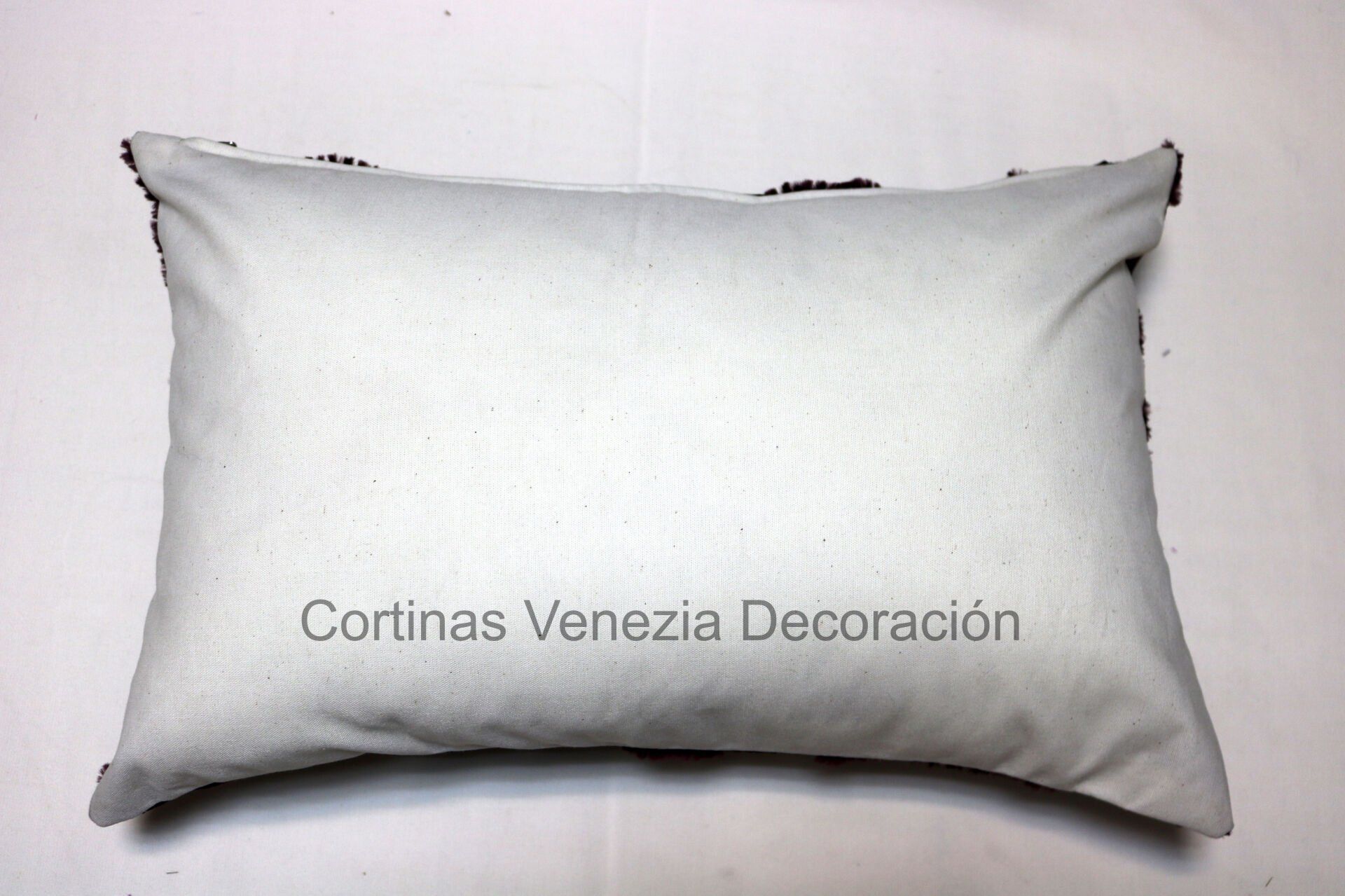 Funda de cojín color morado con aplique de hilo.