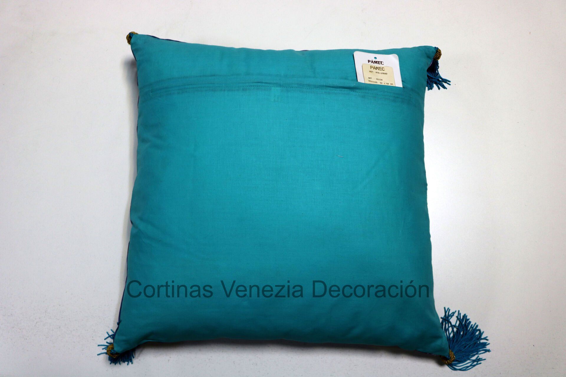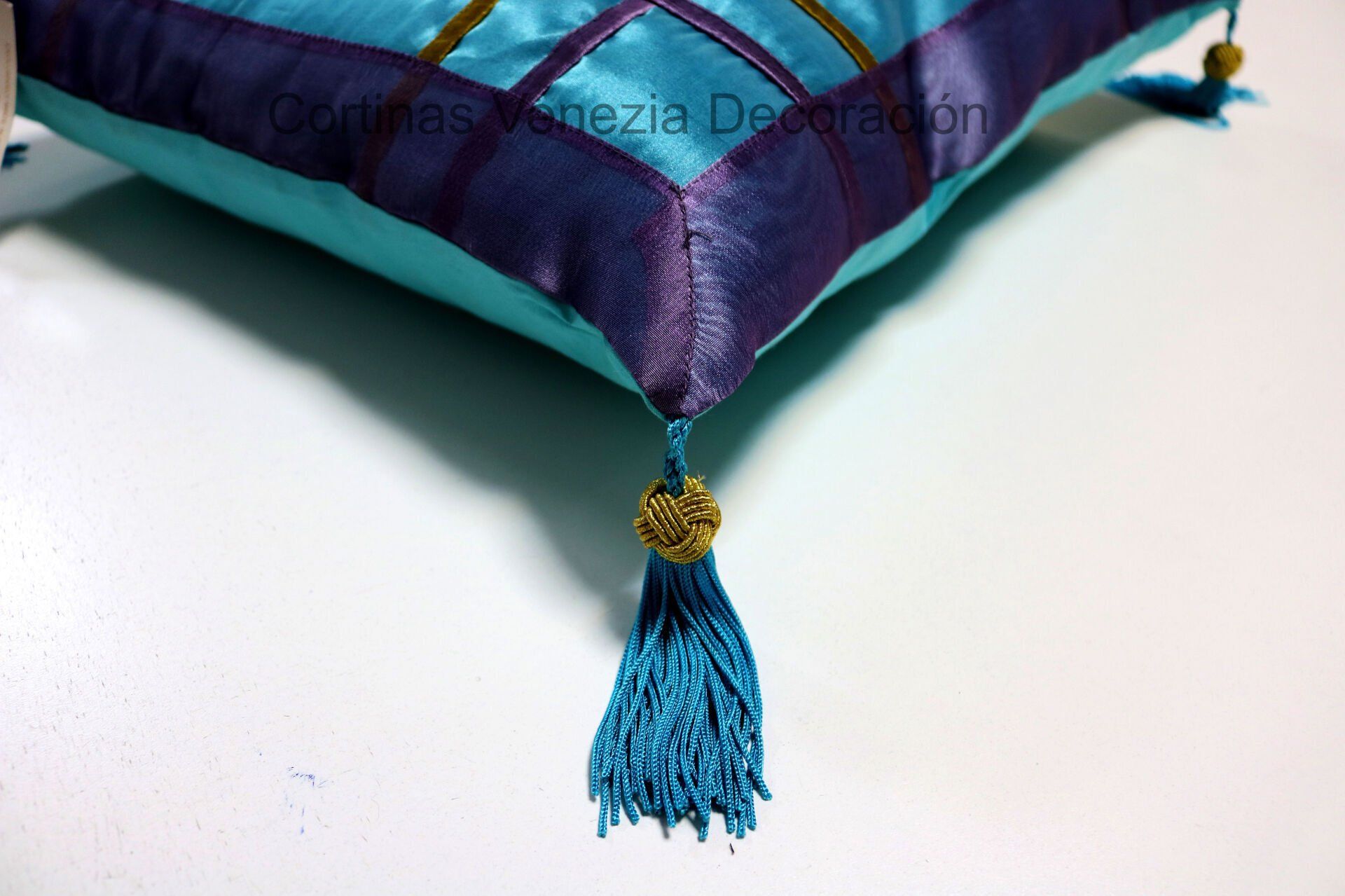 Funda de cojín de seda natural color azul con apliques y borlas. Producto artesanal, confeccionado a mano.