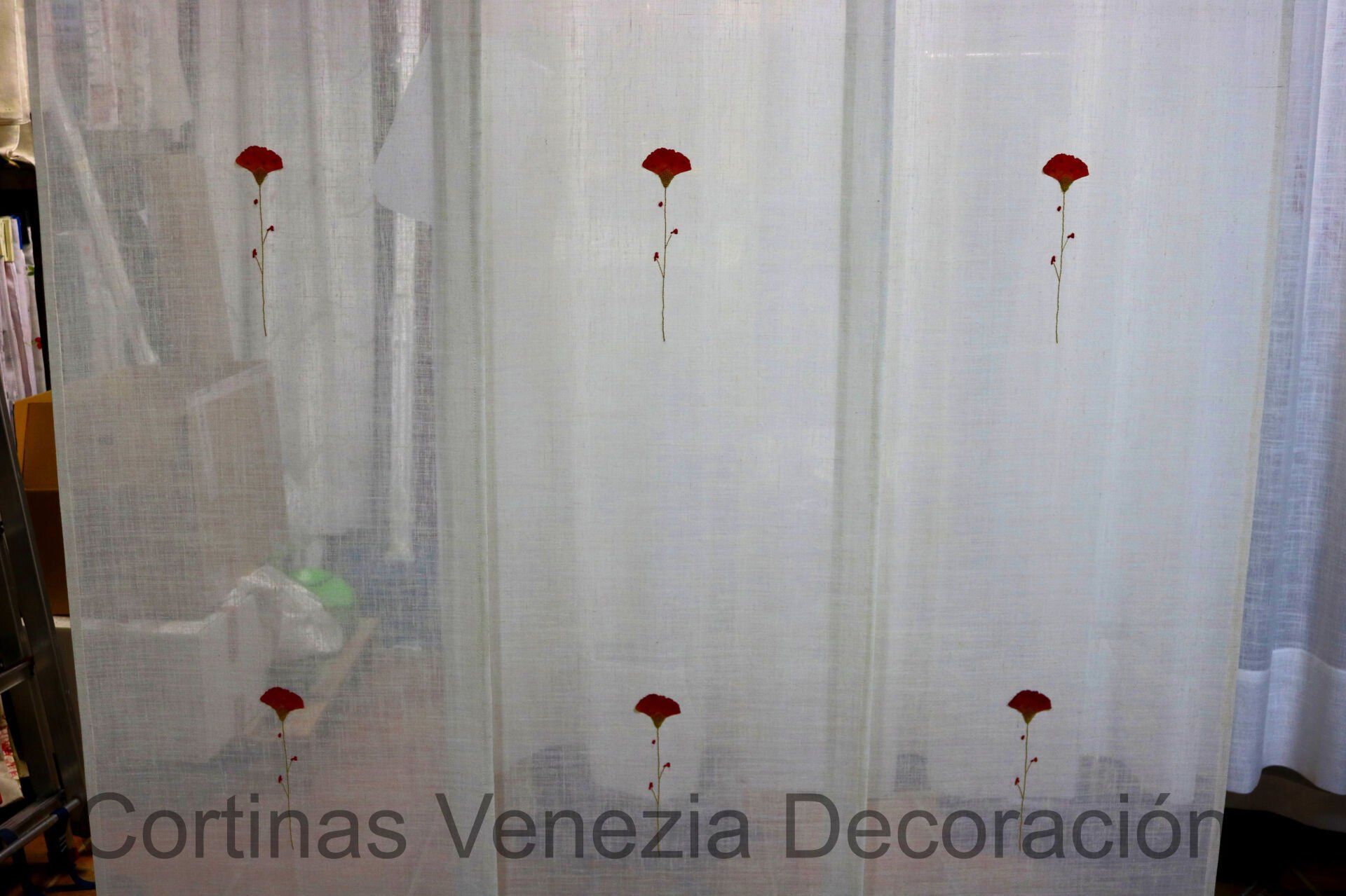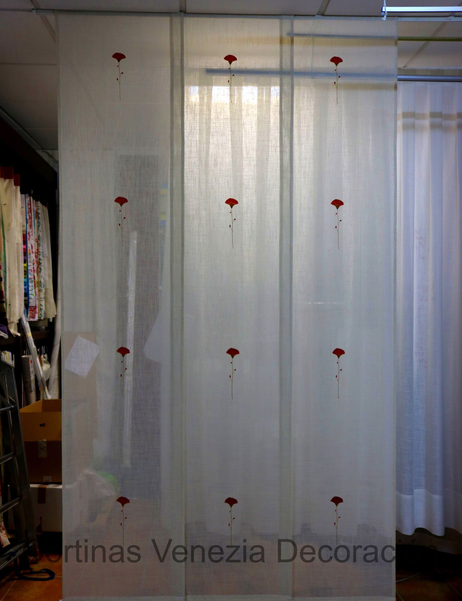 Panel Japonés de tres hojas, de tejido color beige con bordado de claveles en tonos verdes y granates.