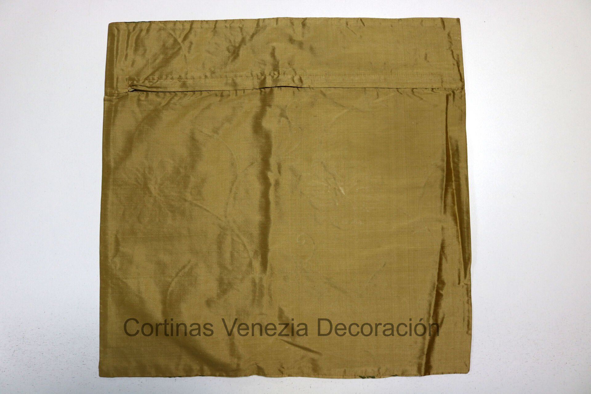 Funda de cojín de seda natural color dorado oscuro, con bordados florales de hilo verde, granate y rosa satinados.
