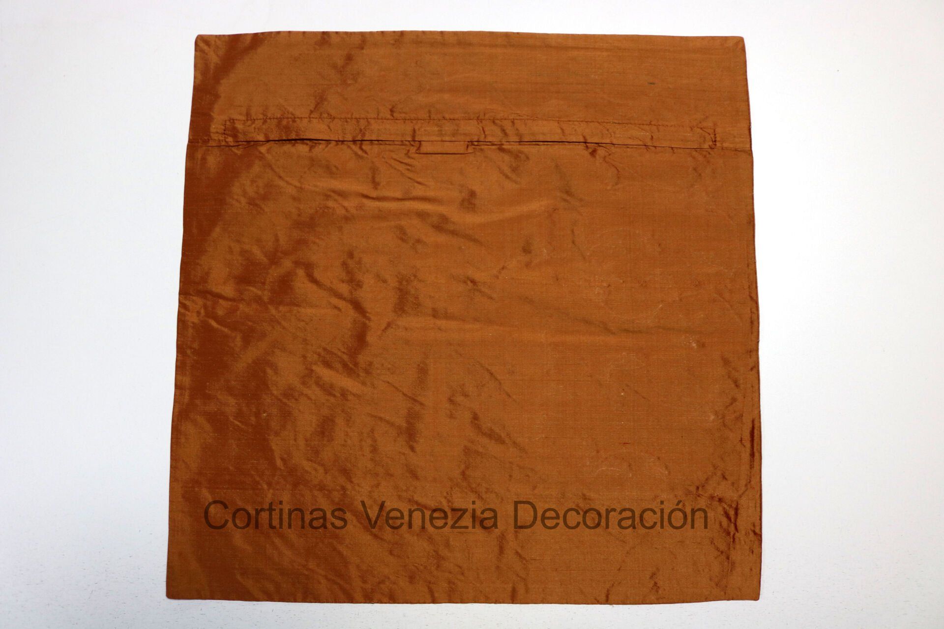 Funda de cojín de seda natural color teja, con bordados florales de hilo marrón satinado y dorado.